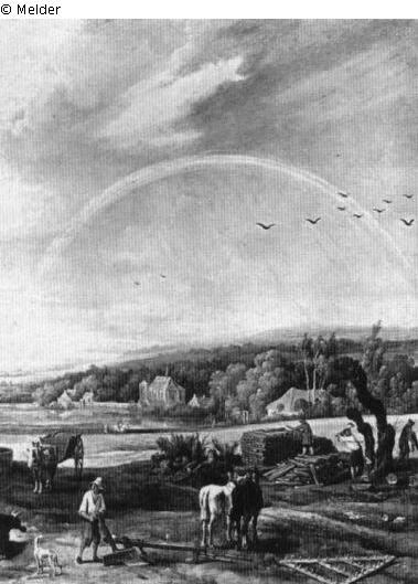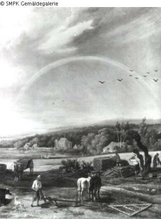 Landschaft mit Regenbogen und Holzfällern