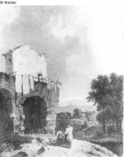 Ruins with two large arches over looking a landscape. By the ruins are two women, one with a child in her arms. A group of trees to the right.