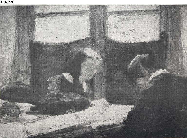 Handschriftliche Notiz von J. TEMPELAERE: "Les brodeuses: la mère et une sœur de l'artiste, peint vers 1857. Acheté par moi en 1910." ("Die Stickerinnen: die Mutter und eine Schwester des Künstlers, gemalt um 1857. Von mir 1910 gekauft".)