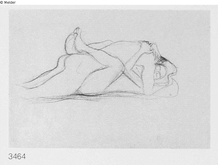 nach Werkverzeichnis Strobl, Nr. 3464: Liegendes Liebespaar, schwarze Kreide. 316 : 447; Bez.: "R" (die Bezeichnung "R" deutet darauf hin, daß das Blatt; mit den Studien für den Beethovenfries im Zusammenhang steht); Privatbesitz; Beethovenfries 1902 (Novotny-Dobai Nr. 127) und "Goldfische" 1901/02 (Novotny-Dobai Nr. 124)