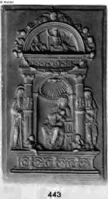 Bange-WV, Nr.: 443 (Α. N. 731. Inv. 1078.) Titel: Madonna mit Heiligen. Maria mit dem Kind an der Brust sitzt nach links gewendet in einer Muschelnische. Zu ihren Füßen links und rechts je ein lautespielender Engel. Links steht der hl. Antonius von Padua, rechts der hl. Hieronymus neben schweren Säulen, die mit einem Kinderfries verziert sind. Oben von einem Cherub und Voluten gekrönt ein Bogenfeld mit der Auferstehung Christi. Über dem Gesims links und rechts ein Puttenpaar, das eine Girlande hält; Halbrelief. Bronze. Η. 11,7, Br. 6,9 cm. An der äußeren Rahmenleiste eine Durchbohrung;