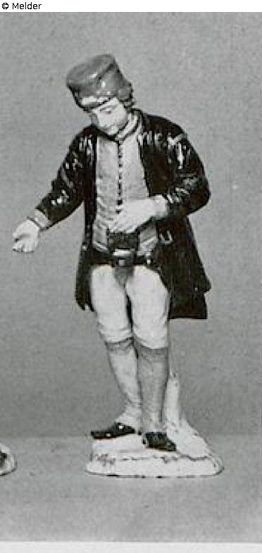 „Ein Markscheider mit dem Kompaß (um Leib an Gürtel befestigt), mit einer Klappe oder ledernem Deckel, den er mit der Hand in die Höhe hält.“ Stehend, die linke Hand am Kompaß, mit der rechten Hand zur Seite weisend. Kupfergrüne Mütze, schwarzer Rock, eisenrote Weste, graugrüne Kniehosen, graue Gamaschen, schwarze Schuhe. Sockel und Sockelstütze in Manganbraun und Grün staffiert. Rechter Zeigefinger fehlt. Ohne Marke. Modell von Simon Feilner, nach dessen eigener Beschreibung die zweite der 11 von ihm geschaffenen Bergmannsfiguren. (Vgl. Chr. Scherer, wie vorher.)