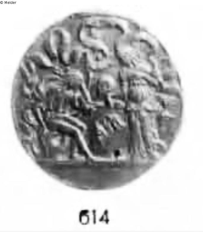 Bange-WV, Nr.: 614 (A- N. 920. Inv. 2053) Titel: Memento mori. Links sitzt ein Jüngling auf einem Baumstumpf, den Kopf auf die Linke gestützt. Von rechts naht eine Frau, die einen Totenkopf in der Rechten hält. Auf dem Spruchband die Inschrift: SI · MEI · SI (oder Ε) . I . C | A V | ANT | ICHIO | TI (oder V) F AI (oder L) I;