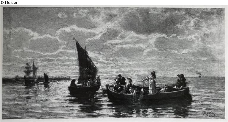 Damen der Gesellschaft; ein Fischer holt das Netz ein. Bez.: H. Rasch München, Goldrahmen.