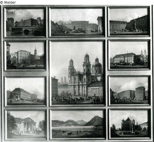 Neunteiliges Tableau mit Ansichten der Theatinerkirche in München, des Tegernsees und Schloßbauten