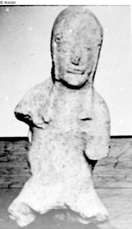 Arme und Beine von der Mitte des Oberschenkels ab verloren. Trägt spitze Kapuze (darauf rote Farbe), die auch die Wangen ebedeckt und von der zwei Troddeln auf die Brust herunter hängen.
