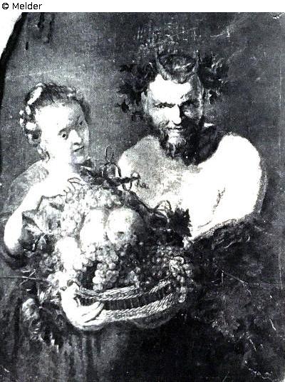 Holzskizze zu dem in der Galerie Schönbrunn befindlichen Gemälde „Satyr und Mädchen mit Früchtekorb" (Satyr with a Basket of Fruits and a Maiden). Das Holz war ursprünglich 33,1, x 24,1 cm groß.