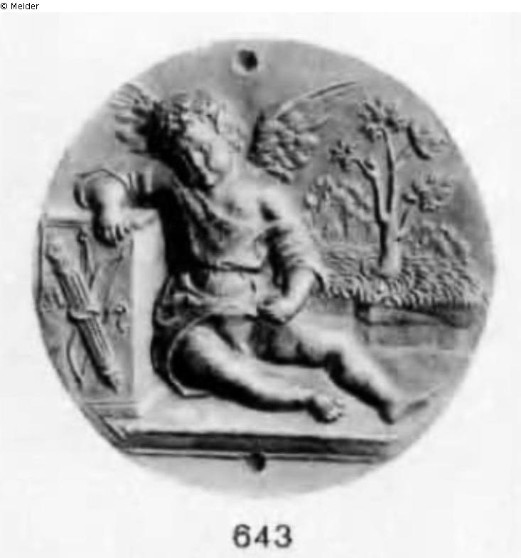 Bange-WV, Nr.: 643 (Α. N. 970. Inv. 1197.) Titel: Schlafender Amor. Mit kurzem Hemd bekleidet, sitzt Amor an ein Postament gelehnt, an welchem Köcher und Bogen hängen. Rechts eine Wiese mit einem Baum. Von Pastorino als Revers der Gracia Nasi- Medaille verwendet (Armand I, 202, 86). Eine Hohlform dieser Plakette befindet sich in der Ambrosiana in Mailand. Halbrelief. Bronze. Rund. Dm. 6,5 cm. Oben und unten je eine Durchbohrung. Kunstkammer;