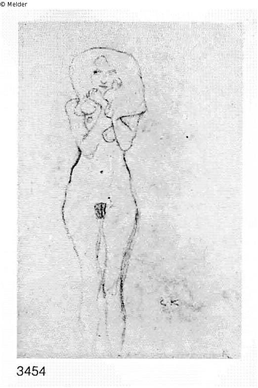 nach Werkverzeichnis Strobl, Nr. 3454: Stehender Akt von vorne, die Hände vor dem unteren Teil des Gesichts, schwarze Kreide, Monogr. re. u.: "G.K." und bez.: "R"; Beethovenfries 1902 (Novotny-Dobai Nr. 127); Studie für die mittlere der Gorgonen des Beethovenfrieses