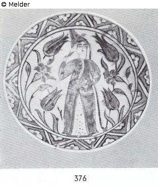tief, bemalt in Blau, Grün und Ziegelrot, mit Figur