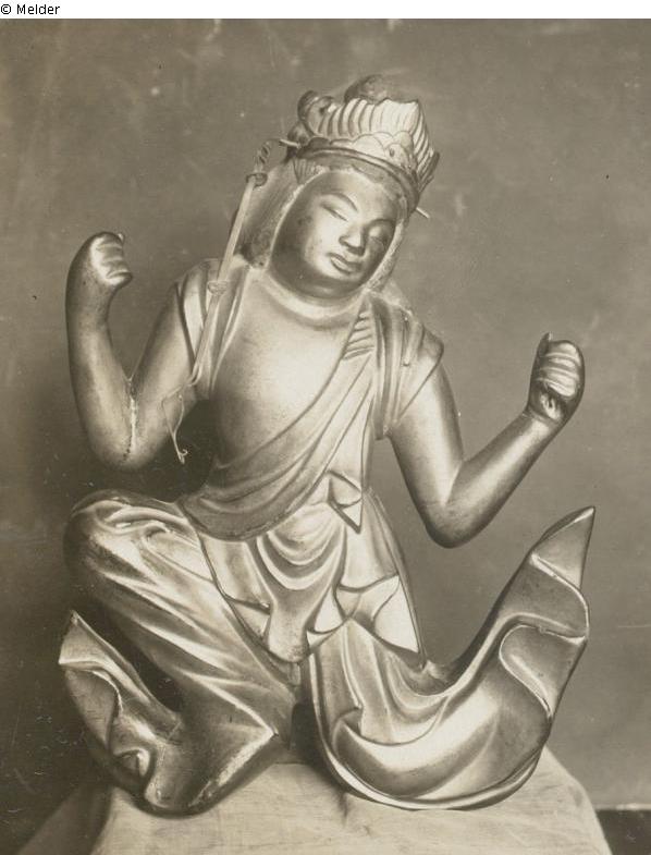 Der Tennin sitzt ruhig am Boden. In beiden erhobenen Händen hält er die Mundorgel. Auf seinem Kopf sitzt ein reich verziertes Diadem mit Gehänge. Die abgeplattete Rückseite zeigt, dass die Figur einem Schrein oder einer Riesengloriole ansaß.