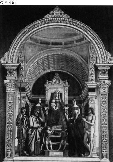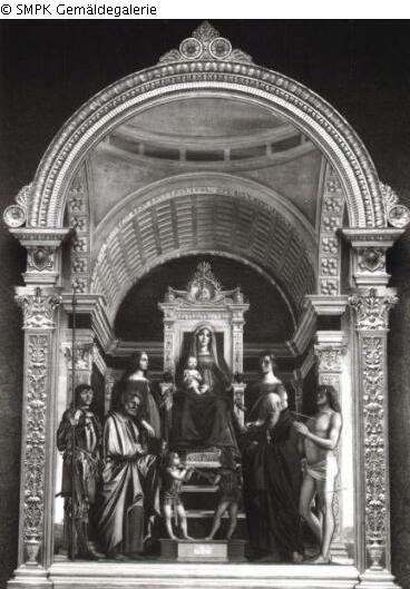 Tafelmalerei: Bild: Maria sitzt oder thront, das Christuskind sitzt auf ihrem rechten Knie : das Christuskind spricht oder macht einen Segensgestus (in Madonnendarstellungen) & Madonna mit Heiligen & der Kriegerheilige und Erzmärtyrer Georg (Georgius); mögliche Attribute: Banner (rotes Kreuz auf weißem Feld), (rotes) Kreuz, Drachen, (weißes) Pferd, zerbrochene Lanze, Schild (mit Kreuz), Schwert & der Apostel Petrus, erster Bischof von Rom; mögliche Attribute: Buch, Hahn, (umgekehrtes) Kreuz, Krummstab mit drei Querbalken, Fisch, Schlüssel, Schriftrolle, Schiff, Tiara & Katharina von Alexandrien, jungfräuliche Märtyrerin; mögliche Attribute: Buch, Krone, Kaiser Maxentius, Palmwedel, Ring, Schwert, Rad & Maria Magdalena, büßende Prostituierte; mögliche Attribute: Buch (oder Schriftrolle), Krone, Dornenkrone, Kruzifix, Salbgefäß, Spiegel, Musikinstrument, Palmzweig, Rosenkranz, Geißel & Hieronymus, Mönch und Einsiedler; mögliche Attribute: Buch, Kardinalshut, Kruzifix, Stundenglas, Löwe, Totenschädel, Stein & der Märtyrer Sebastian; Maria (Jungfrau); Christuskind; Knie; stehen; rechts : sprechen; segnen; Geste & Heiliger & Georg (Heiliger); Banner; Pferd; Schild; Drache; rotes Kreuz (als Attribut des heiligen Georg); rot; Kreuz; Schwert & Petrus (Heiliger); Apostel; Hahn; Bischofsstab; Krummstab; Fisch; Schlüssel; Schiff; Tiara; Schriftrolle; Kreuz; Buch & Katharina de Alexandria (Heilige); Kaiser; Palmwedel; Ring; Rad; Maxentius (Kaiser); Buch; Krone; Schwert & Hure; Maria Magdalena (Heilige); Schriftrolle; Dornenkrone; Gefäß; Salbe; Spiegel; Musikinstrument; Palmwedel; Rosenkranz; Geißel; Buch; Kruzifix; Krone & Hieronymus (Heiliger); Eremit; Kardinalshut; Stundenglas; Löwe; Totenschädel; Stein; Buch; Kruzifix & Sebastian (Heiliger); Pfeil und Bogen; Bogen; Baumstamm