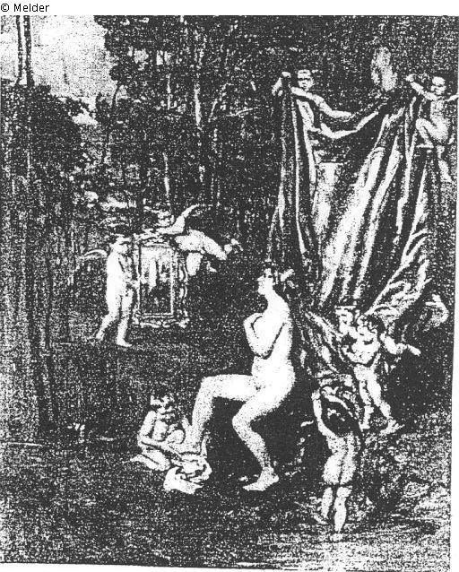 die Göttin, von Amoretten bedient, sitzt vor rotem Mantel im Wald, zwei Amoretten halten ihr einen Spiegel vor; signiert