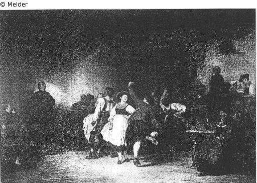 Tiroler Wirtsstube, vier Paare tanzend, Pfarrer schaut strafend, zwei zusehende Alte und ein Paar in der Ecke, Maiskolben an der Decke; Hauptbild des Meisters; signiert