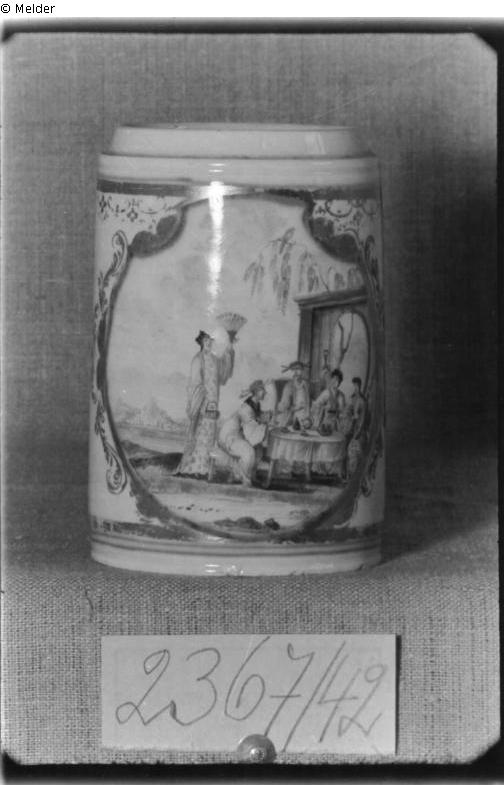Schnorr von Carolsfeld: bemalt mit bunten Chinesenfiguren in geschweifter, scharffeuerblau und golden konturierter Kartusche mit Lüsterfeldern und braun schattiertem, eisenrotem Laubwerk. An den Rändern scharffeuerblaue Kreislinien mit Goldstreifen, am oberen Rand Goldspitzenbordüre, Am Henkelrücken eisenroter Blütenzweig. Im Bildfeld Teegesellschaft von zwei Chinesen und zwei Chinesinnen, die im Freien um einen runden Tisch mit Teegeschirr sitzen, daneben eine stehende Chinesin mit Fächer in der erhobenen Hand. Eine der Frauen spielt die Laute, der eine Chinese hält ein Kelchglas. Hinter der Gesellschaft eine Bretterwand mit ovalem Ausschnitt, dahinter eine Trauerweide. Links Ausblick auf Gewässer und Felsengebirge. Die Farben vorwiegend in Eisenrot, Violett, Grün, Blaugrau und Braun. Um 1723. Ohne Marke. - Das Motiv im Meißener Skizzenbuch bei Herrn G. W. Schulz in Leipzig.