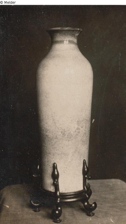 Die Vase hat eine hohe schlanke Form, die sich am Hals verengt. Der Scherben besteht aus einer harten porzellanartigen Masse, die sich im Brand am unbedeckten Boden braun verfärbt hat. Die rahmfarbene Glasur ist weich und durchsichtig und mit Fischrogensprüngelung versehen, die oben stellenweise bräunlich verfärbt ist. Die Verfärbung erfolgte durch langes Liegen in feuchtem Erdboden - die sogenannte Erdpatina. Unter der Glasur befinden sich in einfacher naturalistischer Auffassung Blätter, die freihändig eingeschnitten wurden. Der Holzuntersatz ist fünffüßig.