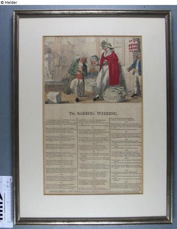 Print of a barber kneeling at the feet of a fishwife. Heading to a song of twenty-five verses printed in three columns.
