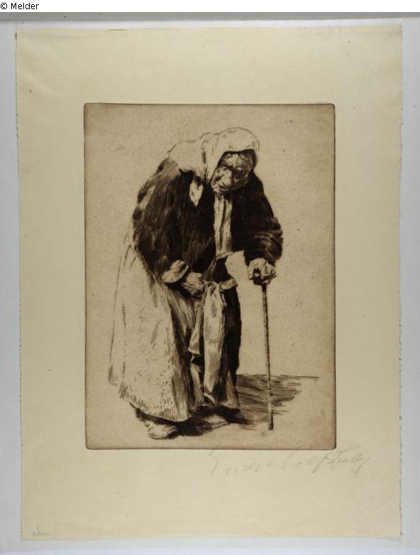 With pencil designated on the lower right: "Erich Wolfsfeld". In the lower left corner of the front page note "8. Bettlerin". Under passepartout typewritten with the title of the work on the left and the artist's name on the right.