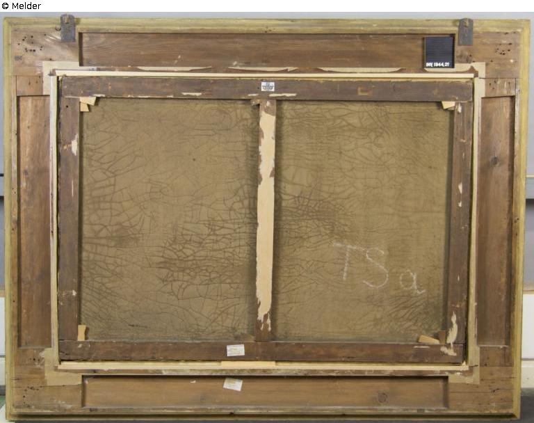 The open-air painting shows the outside area of a shipyard on the banks of the Elbe near Finkenwerder. Several men are working on a damaged sailing boat. A densely leafy tree on the right shades their workplace. Numerous planks of wood are leaning against the trunk, and other pieces of wood have been placed next to it in a disorganised manner. A chicken is pecking in the sawdust that forms a soft, flat cushion around the boat. A rooster standing close by seems to be attentively observing the viewer of the picture. In the background, a short footbridge leads onto the water. Back: top left on frame: number "182" circled in pencil, right side of frame: "Heumann" in pencil, bottom right: Inv. no. old stock: "AB1401" in red chalk and as grey sticker.