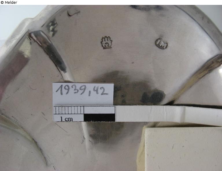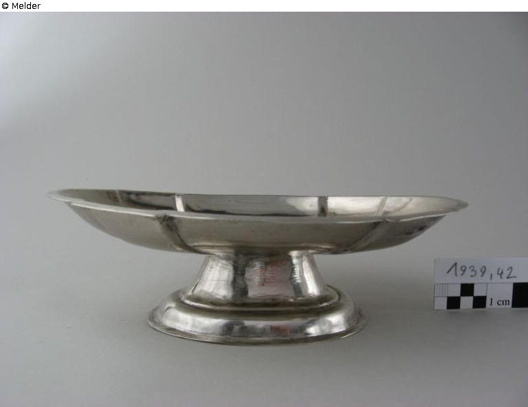 The small, silver drinking bowl is oval and has a decorative design with eight folds. The folds cause the flat rim to spring back and forth slightly. The bowl rests on a smooth-walled, short centre piece that widens conically towards the bottom and is set on a curved foot with a flat base ring.