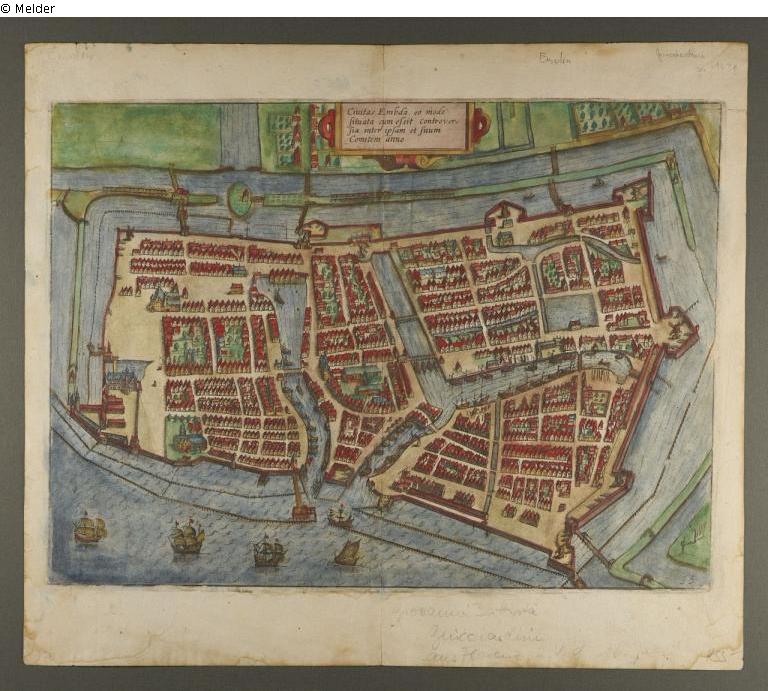 Coloured map „Civitas Embda, eo modo situata cum essit controversia inter ipsam et suum Comitem anno“