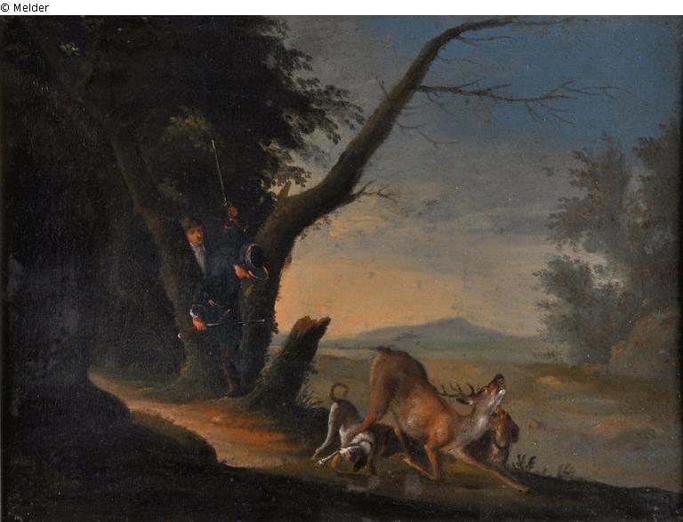 Listed on an undated "Übersicht über die von der Stadt Mainz übernommenen Kunstgegenstände aus dem Besitz der abgeschobenen Juden" in the house archives of the Landesmuseum under the identification No. "M. L." as "Jagdszene" (50 RM)