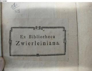 pastedown with bookplate: Ex Bibliotheca Zwierleiniana; on the front half-title: v. Zwierlein; on the back half-titel with pencil: T. 1205 [...]