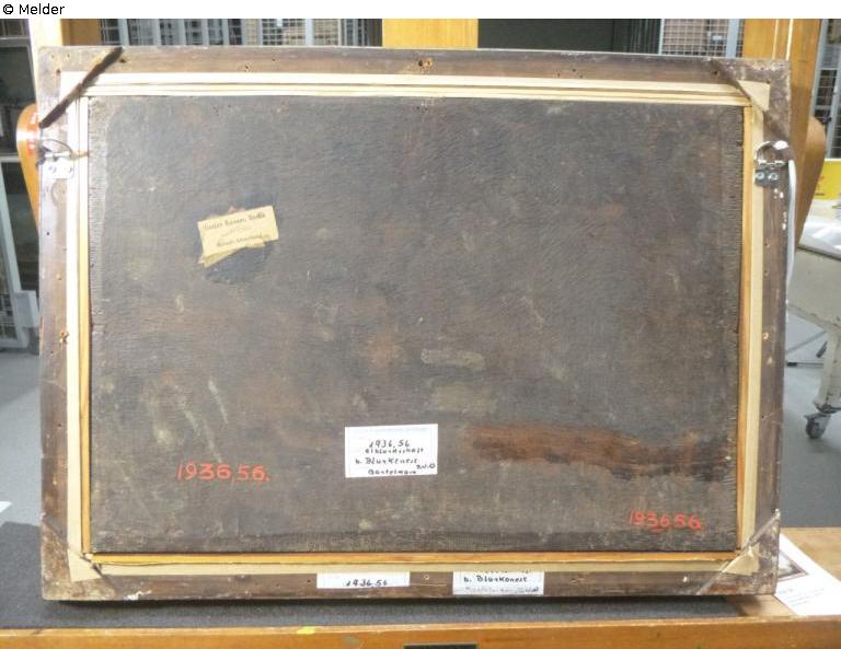 The road leads from the shore between densely leafy trees up a hill on which a thatched house can be seen. Reverse: double inv. no. "1936,56" in red colour, 1 yellowed sticker "Gustav Knauer, Berlin | 9880 | Kunst-Abteilung"; new sticker: "Museum f. Hamburgische Geschichte, Inv. Nr. 1936,56 | Titel Elblandschaft b. Blankenese | Artist Bantelmann J.W.D.".
