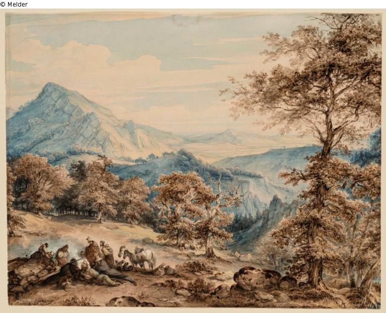 German landscape with rocky mountains and a wide view, in the foreground stately oaks and a group of camped gypsies (historical title).