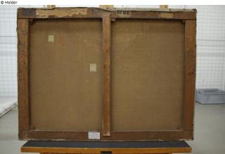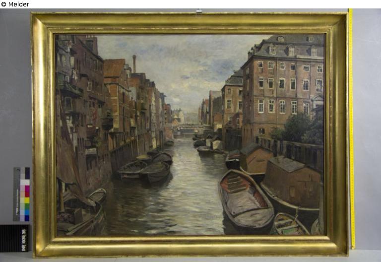 Back: Frame top left: several stickers on top of each other with handwritten inscription: "10. Hamburger Fleet [numbers]", below: "KVH" (Kunstverein Hamburg) next to it: “Prof. Theodor Hagen Weimar Fleet”, next to it a rectangular sticker is missing, right next to it: “Leipziger Kunstv[erein] 9010”, right next to it crossed out writing, further right sticker with handwritten “10 Hamburg”, right next to it: “Fleet”, on the frame right to the bottom: Sticker of "F. K. V. No." (Frankfurter Kunstverein), to the right of it handwritten "N. 8", frame below: from the right: inscription "13 T [...] 11", to the left of it follows a sticker of the MHG with the picture data, on the left side of the frame below the inscription "B2 SMk" to the right of it: "1086" in blue writing, next to it or above it: Sticker with number "008" and "Garderobe-Gebühr 10", on the centre piece: with blue writing: "293. 49 mm", on the RS of the canvas: upper left half: with red crotch Inv. no. of the MHG "1939,38"