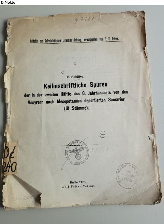 Found-Object Report | Object report Keilschriftliche Spuren der in der zweiten Hälfte des 8. Jahrhunderts von den Assyrern nach Mesopotamien deportierten Samarier (10 Stämme). Lost Art-ID632708 Previous Next Author Schiffer, S. Publisher Peiser TitleKeilschriftliche Spuren der in der zweiten Hälfte des 8. Jahrhunderts von den Assyrern nach Mesopotamien deportierten Samarier (10 Stämme).Place of releaseBerlin Date of publication1907Object typeBookGroup of reported objectsLibrary objectsSignatureNicht im Opac, Dc 205Description stamp "Reichsinstitut für Geschichte des neuen Deutschlands" (G7461). Read more Read less Published since28.10.2025 Contact Ludwig-Maximilians-Universität Institut für den Nahen und Mittleren Osten Bibliothek Veterinärstr. 1 80539 München Germany Phone0049-89-2180-3039Homepagehttps://www.naher-osten.uni-muenchen.de/institut/bibliothek/index.html Contact Prof. Dr. Ronny VollandtPositionProfessor für JudaistikE-Mailronny.vollandt@lmu.de