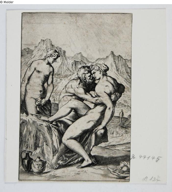 Two nude women and an old man in a rocky landscape.