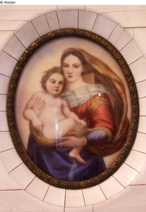 Religiöse Darstellung (Detailkopie nach der Sixtinischen Madonna, Dresden, Gemäldegalerei Alte Meister); unsigniert; Vorderseite mit der Aufschrift (in Farbe): "Raffaello"; Rückseite: Aufschrift mit Bleisift "Jisef (oder Gisel) Hadseva.", mit grüner Tinte "BN:"