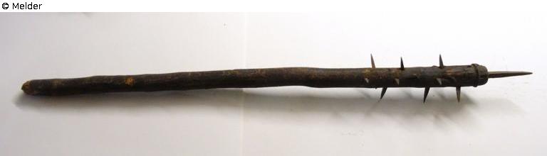 Found-Object Report | Object report Morning star (peasant weapon) Lost Art-ID626641 Previous Next Artist / Creator Unknown TitleMorning star (peasant weapon) Dating1601/1800Object typeWeaponGroup of reported objectsMilitariaMaterial / TechniqueWood ; Metal (Iron)MeasuresTip length: 10 cm Diameter 11.00 cm Length 106.00 cm Inventory numberK 1938/88,1Description Upper, somewhat thicker end studded with twelve square iron spikes, the upper edge surrounded by thick iron wire. Square point on the upper side. Read more Read less Provenance From the delivery of weapons from Jewish property transferred by the Regensburg Police Directorate, Jan. 1939 Read more Read less Published since21.03.2025 Contact Museen der Stadt Regensburg Dachauplatz 2-4 93047 Regensburg Germany Phone0941/507-4440 Fax0941/507-4449Homepagehttp://www.regensburg.de/museen