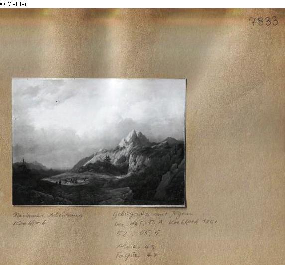 Found-Object Report | Object report Mountain landscape with hunters Lost Art-ID528230 Previous Next Artist / Creator Koekkoek, Marinus Adrianus Birth 1807.09.25, Middleburgh Death 1868.01.28 / 1870, Hilversum / Amsterdam Place of activityHilversum TitleMountain landscape with hunters Dating1858Object typePaintingGroup of reported objectsPaintingMaterial / TechniqueOil ; Canvas / painted Height 52.00 cm Width 65.50 cm Inventory numberMü.7833Description Right Mountain range, with plateau next to twin peaks. In the foreground scenery. Read more Read less Published since03.08.2015 Contact Bundesamt für Auswärtige Angelegenheiten Kirchhofstraße 1-2 14776 Brandenburg Germany E-MailI-AU-RL@bfaa.bund.de