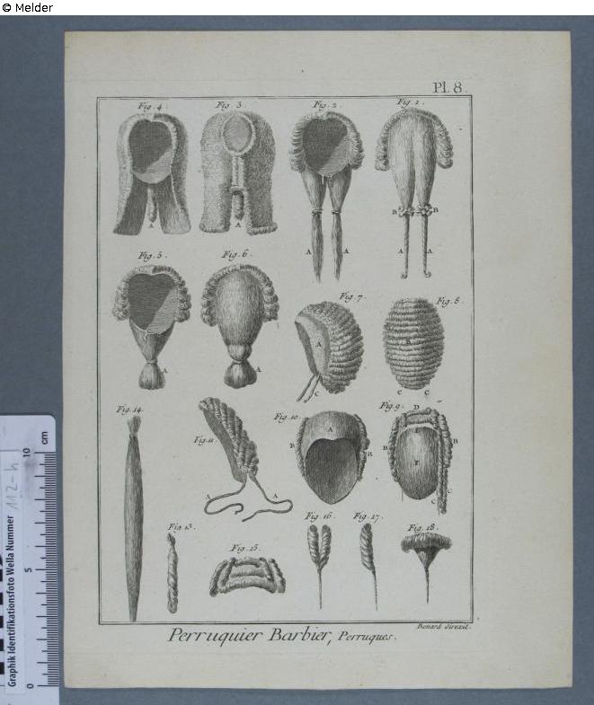 Plate from Denis Diderot's "Encyclopédie, ou dictionnaire raisonné des sciences, des arts et des métiers" on wigmaking found in "Recueil de Planches, vol. VIII." This print shows front, rear, and side views of various types of wigs with detail drawings of curls.