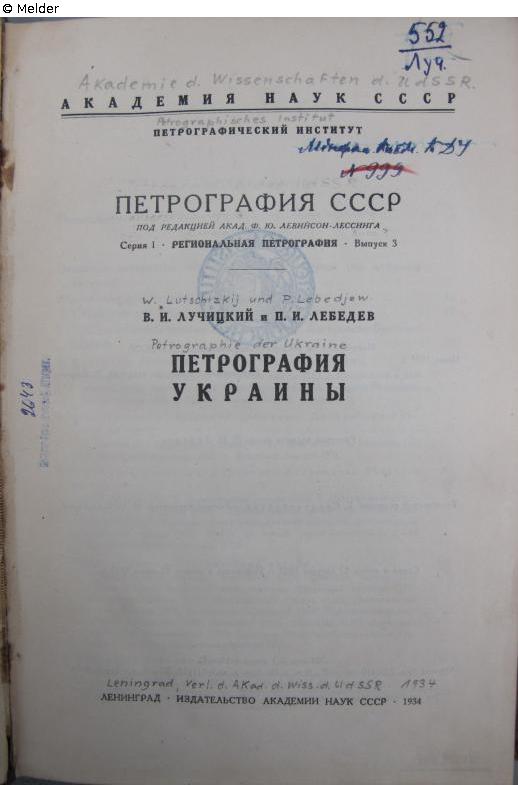 8°, on title page unrecognisable note Mineralogisches Kabinett der KDU [Kiev State University] No. 999 and unrecognisable stamp Kabinett der geologischen und geografischen Literatur [der KDU]