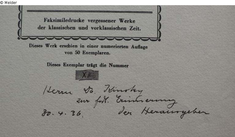 Handwritten dedication: "Herrn Dr. Kinsky zur frdl. Erinnerung, 30.04.36. Der Herausgeber"; circular stamp: "Musikwissenschaftliches Institut der Universität Köln"; handwritten inventory number: "9,1100";