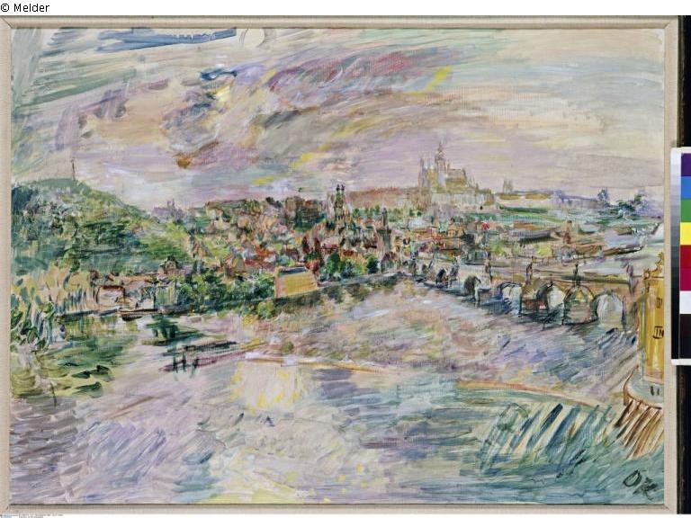 Designation front, bottom right: OK; designation back / stand area: outer frame top left (handschriftl. , blue) : "K 49 B 1" (or : K 49/31 ? ); Outer frame above (handwritten, white): "E 3 310X..F 1220" (?, not quite legible); Outer frame right bottom (handwritten, white): "MARLBOROUGH"; Outer frame bottom (handwritten, white, upside-down): HAMBURG"; outer frame left (handwritten, yellow): "181" (not very legible); Stretcher top left: Sticker "Marlborough Fine Art Ltd., 39 Old Bond Street, London W1", labled with unitspan 88 x 115 cm, dated 1936/37 , No 1657 and english entitled "Prague view from the Banks of the Vltava River", designation handwritten (pencil)" 15500 GBP"; Stretcher top left: little white price tag: "52,000 USD". On the canvas top left: two round stamps (Customs stamp); exhibition label Bielefeld in 1995 and Guggenheim.