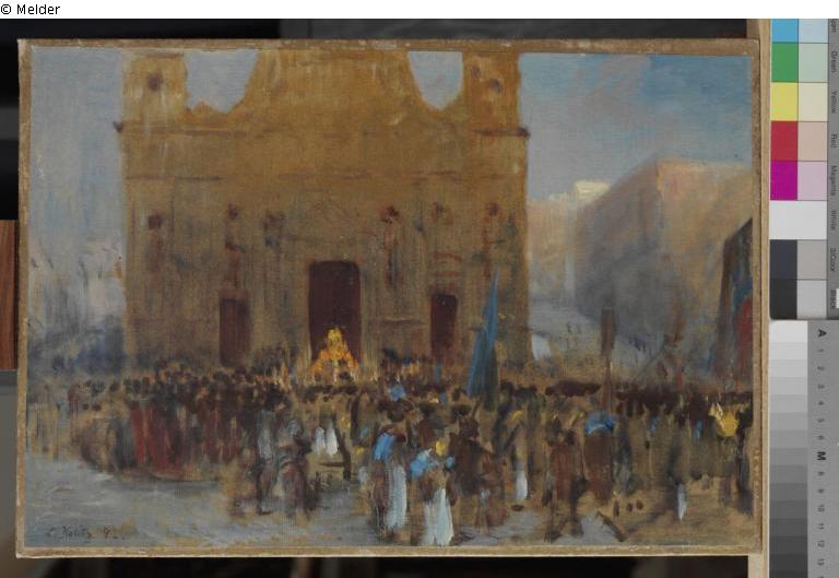 Found-Object Report | Object report Procession in front of San Pietro, Frascati Lost Art-ID596120 Previous Next Artist / Creator Kolitz, Louis Birth 1845.04.05, Tilsit Death 1914.07.24, Berlin Place of activityDüsseldorf; Kassel; Berlin TitleProcession in front of San Pietro, Frascati Dating1892Object typePaintingGroup of reported objectsPaintingMaterial / TechniqueOil ; Paper ; Cardboard / painted ; mounted Height 28.50 cm Width 42.70 cm Inventory numberAZ 69Provenance purchased 1942 from the Gurlitt Gallery, Berlin Read more Read less Published since13.07.2021 Contact Hessen Kassel Heritage / Neue Galerie Schloss Wilhelmshöhe Schlosspark 1 34131 Kassel Germany Phone(0561) 31680-153 Fax+49-(0)561-31680-111E-Mailinfo@heritage-kassel.deHomepagehttps://www.heritage-kassel.de Contact Dr. Justus LangePositionProvenienz-, Rückgabe- und RestitutionsanfragenPhone+49 (0) 561-31680-112E-Mailjustus.lange@heritage-kassel.de