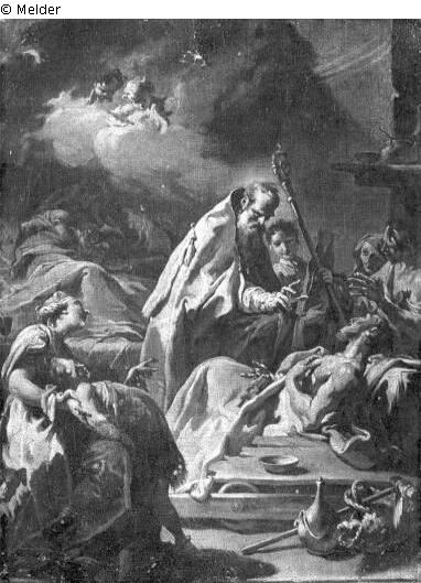 Found-Object Report | Object report Scene of a legend: Bishop blessing a dying person Lost Art-ID219315 Previous Next Artist / Creator Pittoni, Giovanni Battista (der Jüngere) (Vermutlich) Birth 1687, Venedig? Death 1767.11.17, Venedig? Place of activityTurin; Parma; Neapel; Venedig TitleScene of a legend: Bishop blessing a dying personObject typePaintingGroup of reported objectsPaintingMaterial / TechniqueOil ; Canvas / painted Height 40.50 cm Width 29.50 cm Inventory numbermü2361/2Description Bischof heilt einen vor ihm liegenden, lahmen Bettler. Vorn links eine Frau mit krankem Kind, darüber in Wolken zwei Engelsköpfe. Read more Read less Holding Kulturgüter aus dem ehemaligen ReichsvermögenPublished since2001 Contact Kunstverwaltung des Bundes Herbert-Bayer-Straße 5 13086 Berlin Germany E-Mailprovenienzforschung@kvdb.bund.deHomepagehttp://www.kunstverwaltung.bund.de
