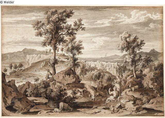 Serpentine landscape with herds by the fire