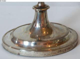 The large, three-flame candelabra stands on a moulded, oval base, which supports a baluster shaft that is offset several times and widens slightly upwards in a conical shape. A chalice sits on the shaft, supporting a small, plate-shaped top with three candlestick arms. The slender, smooth candlestick arms first wrap around a cup-shaped ornamental piece in the centre of the top several times and then swing out to three sides in a further twist. Each chandelier arm carries a round eaves bowl with an open, vase-shaped spout for the light. Dotted on the edge of the foot: ‘P.H.’ (in italics); on the chalice of the shaft: ‘N:2’, belongs together with object inv. no. 1935,126