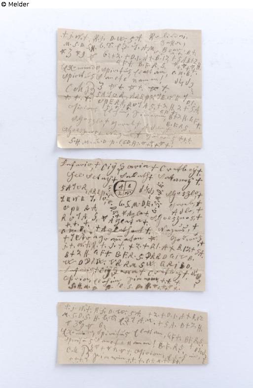 Lined papers with handwritten notes, partly in German script, partly in Latin capital letters. The texts consist to a large extent of individual letters, which are separated by a dot, only isolated are whole 'words', u.a. the sator formula, readable.