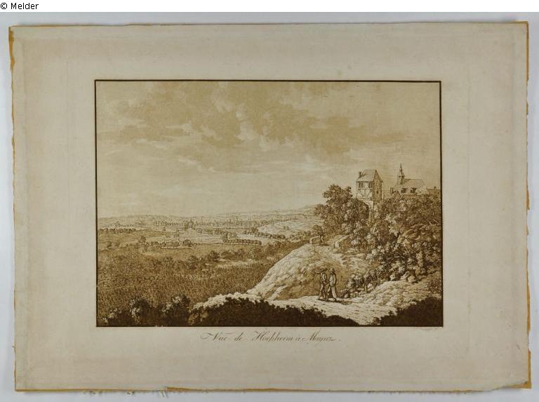 Designation: lower left: "Vue de Hochheim à Mainynz."; lower right: "J. S. Knüppfer fec."; watermark "H.B.". On the back: on the upper right corner note "Ref. 17", below in the middle of the sheet margin "Neg. No. 23". Under passepartout.
