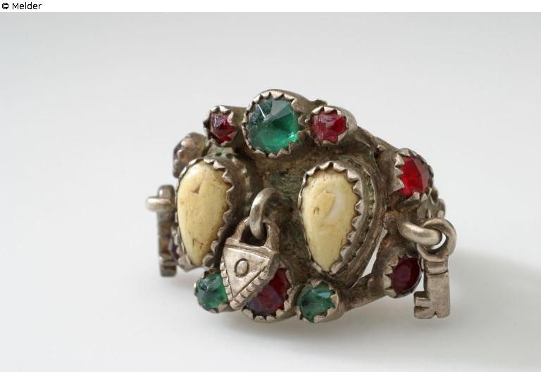 Thick ring with broad plate, on this box version two pointed oval (leg) inlays, between and left and right hanging small triangular lock and two little keys. The whole thing framed by green and red glass stones. At the base of the ring rosettes over half arches, the ring diagonally divided by engraved ribbons.