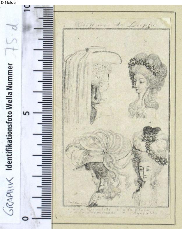 Found-Object Report | Object report Women's hairstyles from Leipzig and Dresden Lost Art-ID622906 Previous Next Artist / Creator Dornheim, Johann Carl Birth 1760, Gotha Place of activityLeipzig; GothaLast mentioned1810 TitleWomen's hairstyles from Leipzig and DresdenObject typePrintGroup of reported objectsGraphicMaterial / TechniquePaper / printed (copper engraving) [?]Inventory numberWe-GR 75 dDescription Stamp:verso unknown round stamp in blue approx. 20 x 20 mm, with a deer Read more Read less Provenance Unknown owner; [...]; ? - ?: Erhardt Ströher (1924-1977), Darmstadt; before 31.12.1963 - 2013: Museum Wella Darmstadt, acquired from Erhardt Ströher; 2013: donated to the HLMD Read more Read less Published since22.07.2024 Contact Hessisches Landesmuseum Darmstadt Friedensplatz 1 64283 Darmstadt Germany Phone+49 6151-3601-200Fax+49 06151-1657199E-Mailinfo@hlmd.deHomepagehttps://www.hlmd.de/de/ Contact Dr. Martin FaassPositionDirektorPhone+49 6151-3601-001