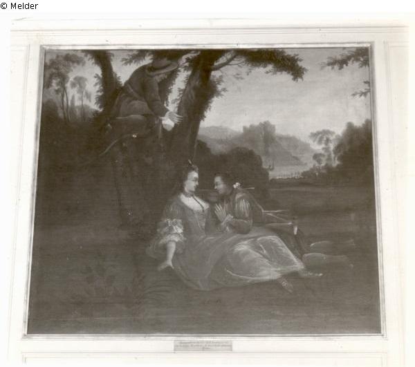 Liebespaar unter einem Baum wird von einem im Baum sitzenden Mann belauscht, Supraporte ; Blauer Führer, Saal 45, S. 53