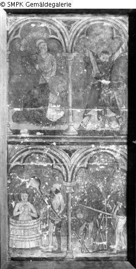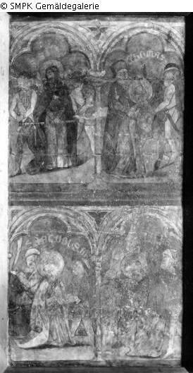 Panel painting: Retable: the group of the following saints (Virgines Capitales) depicted together: Barbara, Catherine of Alexandria, Margaret, later also Dorothea : Margaret of Antioch, virgin martyr; possible attributes: Cross, crown, dragon (under the feet or in chains), pearl (necklace) & the group of the following saints (Virgines Capitales) depicted together: Barbara, Catherine of Alexandria, Margaret, later also Dorothea : Dorothea of Caesarea, virgin martyr; possible attributes: Basket of roses and apples, child with basket of roses, garland of roses, roses in hand or lap & canopy; Quattour Virgines Capitales; Virgines Capitales; Barbara (saint); Catherine de Alexandria (saint); Margaret (saint); Dorothea (saint); four; Virgin : Margaret (saint); Dragon; Chain; Pearl; Cross; Crown & Quattour Virgines Capitales; Virgines Capitales; Barbara (saint); Catherine de Alexandria (saint); Margaret (saint); Dorothea (saint); four; Virgin : Dorothea (saint); Basket; Rose; Apple; Child; Garland & Canopy