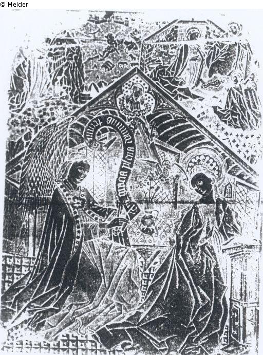 Eglomisé painting in gold and black: Annunciation. Mary kneels at a lectern on the right, the approaching angel with a banner on the left. The background is an interior architecture whose ceiling above the group forms a pediment in which the half-figure of God the Father appears. In the spandrels above, the Visitation and Christmas. Glass, gold, engraved in black and dotted, 27.5 x 19.5, in an Ital. 16th century Italian wooden frame